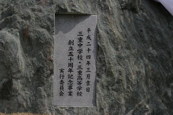 4月19日(木)、創立50周年の記念碑の除幕式が行われました。自然石によるこの記念碑は50周年記念事業実行委員会から寄贈されたもので、梅村光久本部長による『絆』の文字が刻まれています。創立50周年にあたる平成23年に起こった大震災からの復興を願う文字ですが、三重中高にとっては半世紀の歴史と次の半世紀をつなぐ「絆」であり、校訓『真剣味』の下に集う4万人の同窓生と未来の何千何万という後輩とをつなぐ「絆」でもあります。 実行委員長、中高の同窓会長と学園・学校代表の手によって幕が落とされ、同窓生の皆さんと教職員集い、50周年事業の締めくくりとなるイベントが終了しました。
