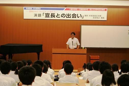 7月2日(土)、創立50周年記念事業の一環として行われている卒業生による講演会など、三重中高版「ようこそ、先輩」シリーズの教養講座が行われました。今回は吉田悦之本居宣長記念館館長(中学9期・高校13期)をお招きし、『宣長と私の出会い』というテーマでお話をしていただきました。これは5月14日(土)に行われた第1回の『宣長と松阪』に続くもので、吉田館長の長年の宣長研究のきっかけとなった書物との出会いを中心に、興味深いお話をしていただきました。