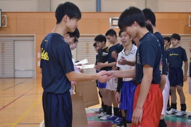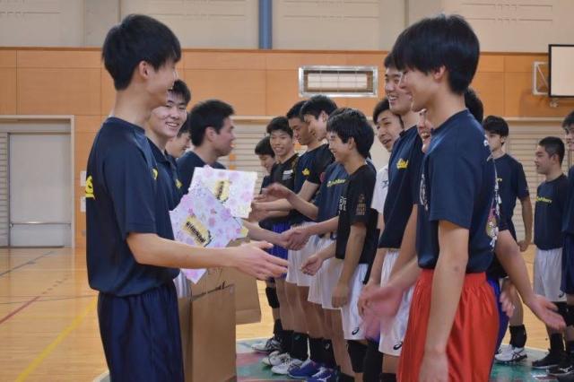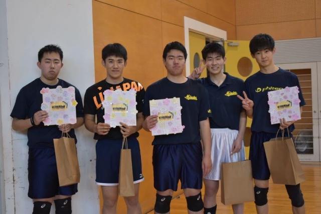 今年度の卒業式は、在校生による恒例の見送りが自粛となりました。そこで、前日に3年生5名を交えて、短時間の練習を行いました。練習の締めくくりは、やはり「ワンマンレシーブ」です。大声援の中、最後までボールに飛びつく姿は、きっと後輩たちの脳裏に刻まれたことでしょう。写真は、記念品と後輩たちの言葉をしたためた色紙をプレゼントする場面です。全国私立高校選手権大会出場権獲得県新人戦第3位・東海選抜大会出場権獲得県優秀選手賞2名数々の実績を残して、卒業していきます。中には指導者を目指す者もいます。それぞれの道で活躍してくれることでしょう。