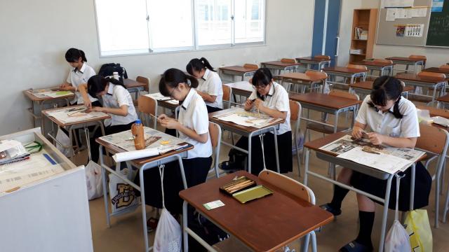 8月25日(土),茶道部員6名が茶杓を削りました。 2時間半,集中して取り組みました。 2年生3名の茶杓は翠巒祭での「月兎茶会」で亭主をするときに使用し,自宅等で削った3名の茶杓を含めて1年生6名の茶杓もお茶会でお披露目する予定です。