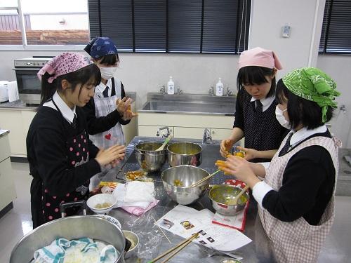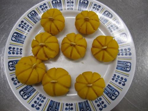 1・2年生14名全員が参加をして,「かぼちゃの練り切り」と「かぼちゃの焼き饅頭」を作りました。高校2年生が中心となって準備を進め,必要な材料を計算して買い物に行ったり分かりやすくレシピを書き換えたりしました。しっかり準備をして当日を迎えましたが,和菓子は難しくて4時間以上もかかりました。