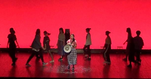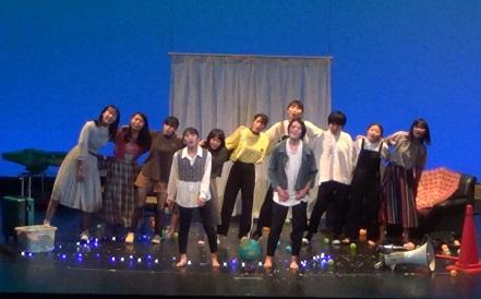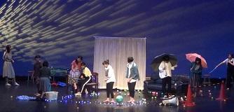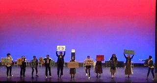 本校の出演は、大会3日目でした。演題は、『ゆらゆら』。高3の山田淳也が創作し、夏の三重県大会を1位『三重県知事賞』作品で本大会に臨みました。11人の1年生部員がいろいろな思いや困難を抱えた18歳の1人の女子を演じ、上級生が演出・照明などでサポートしました。