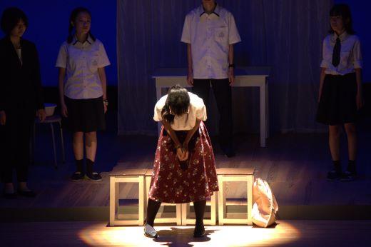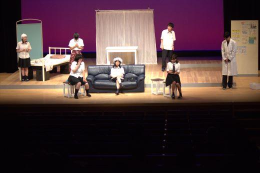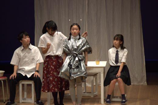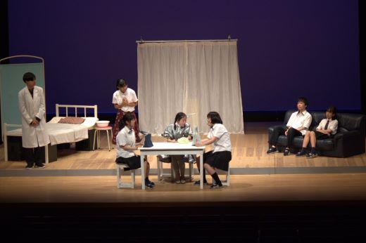 本校は、既成作品の華陵舞作「この星はブルー」で本大会に臨みました。保健室を舞台として、憧れの地球へと移住してきた宇宙人の女子高生と成り行きで宇宙人達に「地球人としての振舞い」を教えることになってしまう先生。一方先生は、かつての教え子の職場での悩みを聞く。そのような中で、先生自身の矛盾が突きつけられる。現代社会の様々な人間関係や生きづらさを高校生らしく生き生きと表現しました。