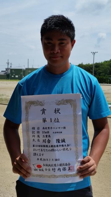 川合隆誠が高校男子ハンマー投を、記録57m48で1位に入賞、大会記録を更新した。