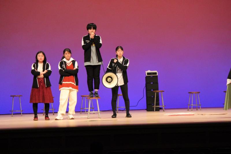 本校の出演は、大会3日目でした。演題は、『ゆらゆら』。高3の山田淳也が創作し、夏の三重県大会を1位『三重県知事賞』作品で本大会に臨みました。11人の1年生部員がいろいろな思いや困難を抱えた18歳の1人の女子を演じ、上級生が演出・照明などでサポートしました。