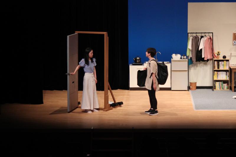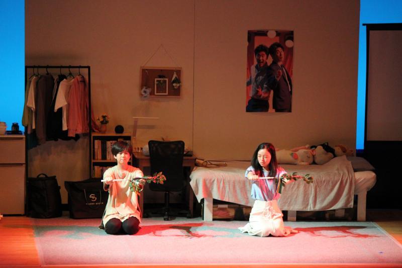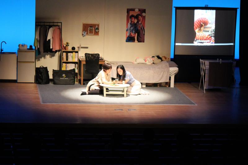 今大会では、演劇部が今大会に向けて書き下ろした**完全オリジナル脚本『巫女舞れでぃず』**を上演しました。キャストはわずか2名というミニマルな構成ながら、幼いころ神社で巫女舞をともに舞った少女たちが、大都会の大学と田舎の大学。進路の異なる大学生活を送りながらも再び向き合う姿を、繊細かつユーモアを交えて描きました。