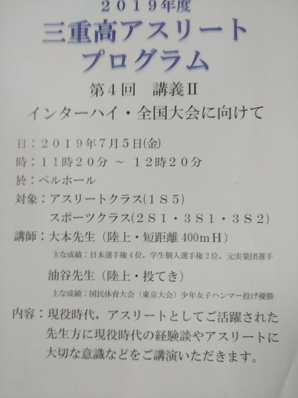 今日は、期末試験の最終日。2限終了後、11時20分より、アスリートプログラム第4回を行った。今回は「インターハイ・全国大会に向けて」とし、全国大会で実績のある陸上部の指導者2名から、それぞれ20分程度講義をしてもらった。食事のとり方や生活リズムの整え方等体調管理についての具体的な話や、如何にして意識を高く持って日常生活を送っていくか等、自身の経験をもとに、アスリートとして大切な心構えなど丁寧に話していただいた。