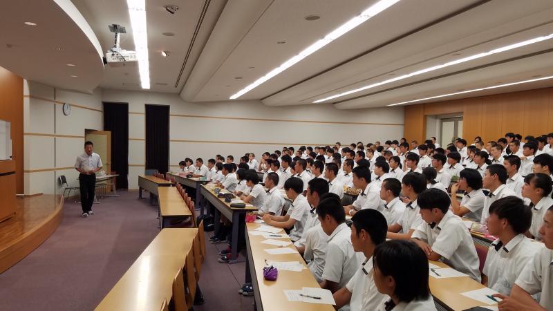 講義の後、担当教員より「夏場におけるベストパフォーマンスのための暑熱対策」について、話された。深部の体温を上げないこと、体内の水分を失わないこと、そのために練習前後に何をするべきか、熱中症への対応のポイント等わかりやすく説明していただいた。生徒は、振り返りシートや自前のノートに熱心にメモを取りながら真剣に聞いていた。