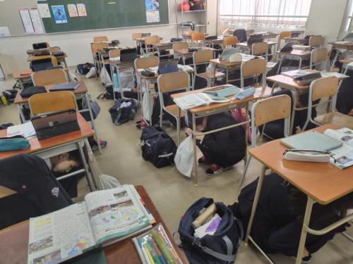 「BLACKなまず」の警報音とともに、各自机の下に退避