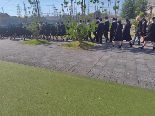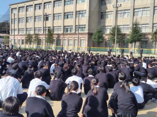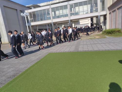 本校には、中学生319名・高校生1535名、合わせて1854名が在籍しており、全校舎から一斉に避難を行う大規模な訓練となりました