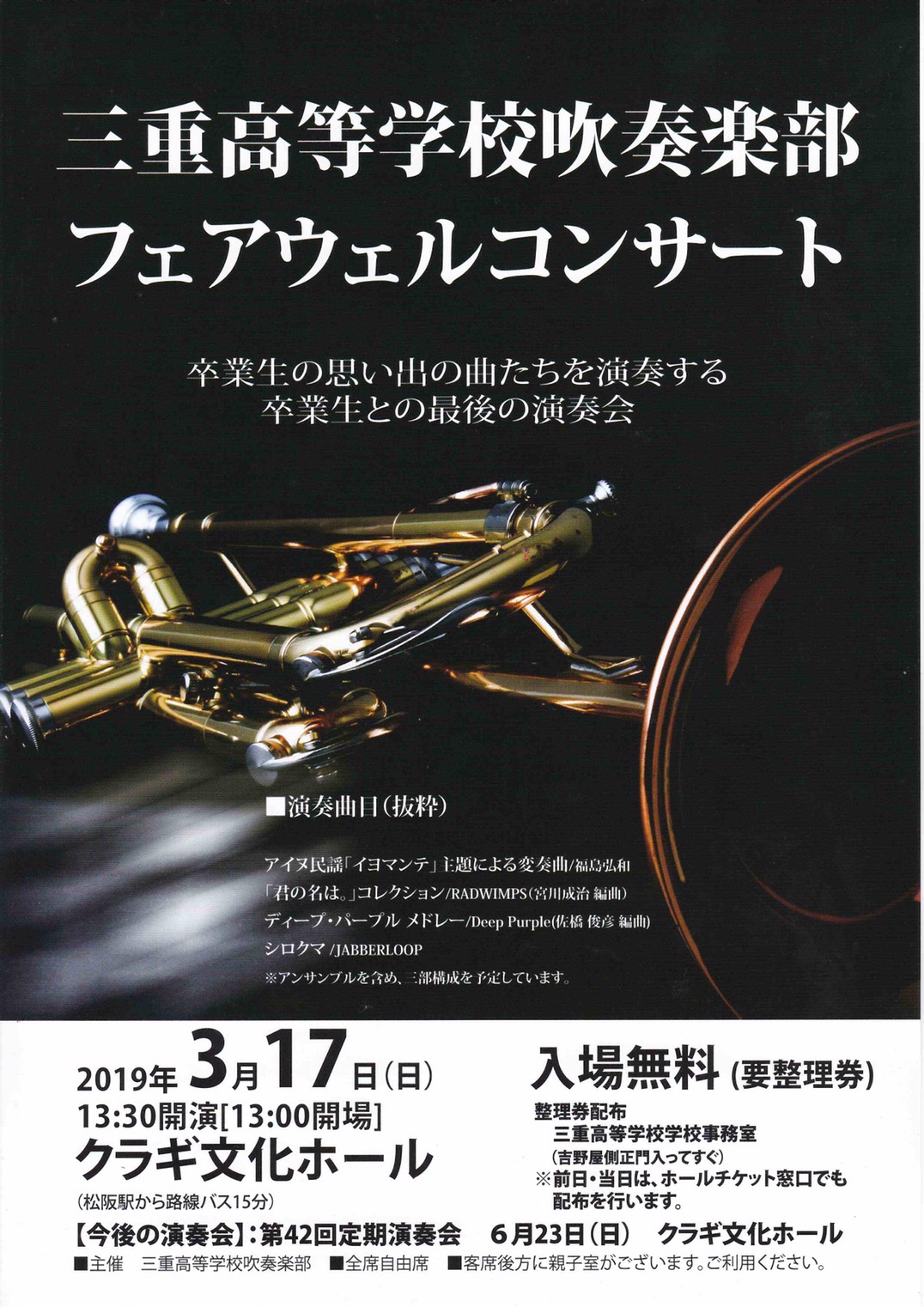 整理券配布場所:三重高等学校事務室、三重中学校事務室