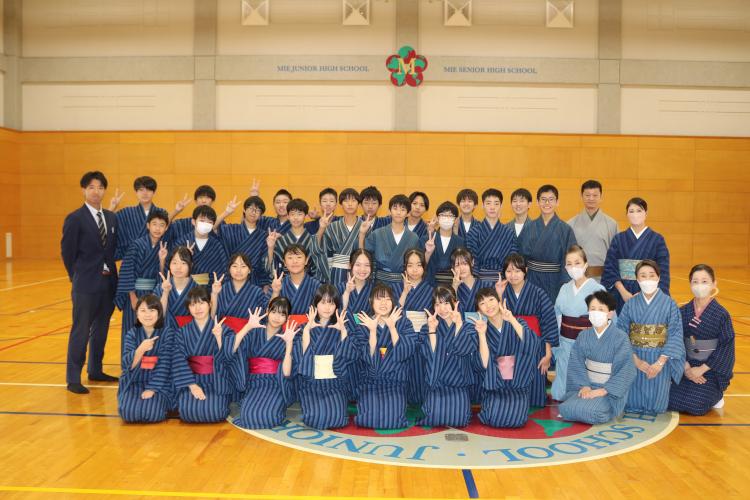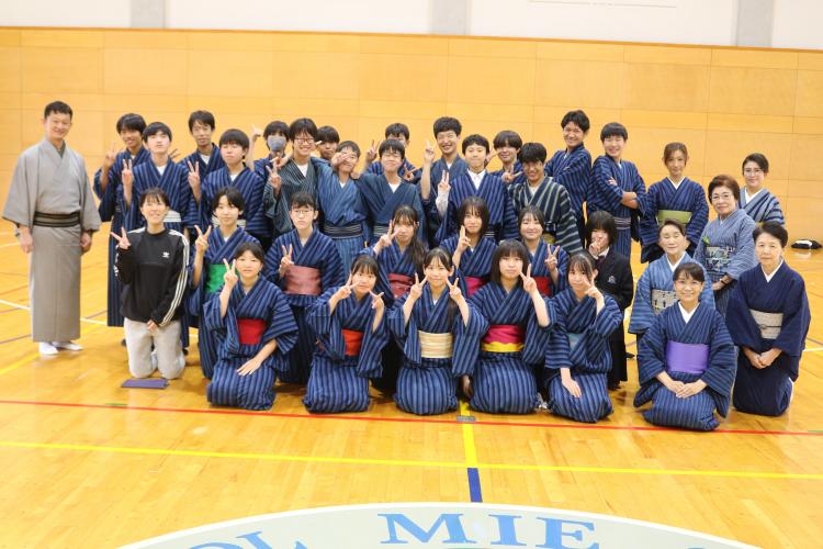 中1で始まった「まつたん」の取り組みをステップアップし、中2は松阪を代表する文化、松阪木綿について学びを深めました。昨年度に引き続き、「和装教育国民推進連合会」のご協力で、7名の講師の先生をお招きし、松阪木綿についてだけでなく、日本の民族衣装である和装について学び、さらに「自分で着物を着る」という体験もさせていただきました。
