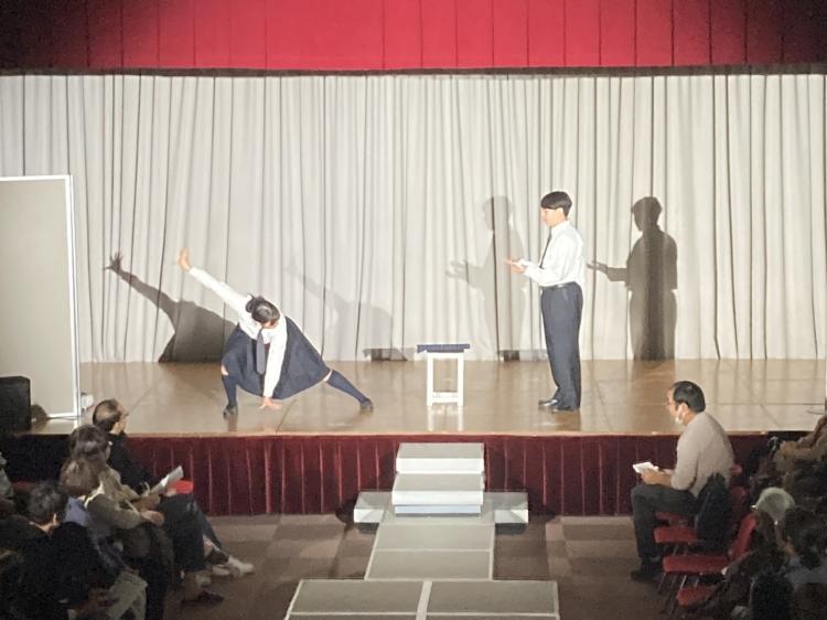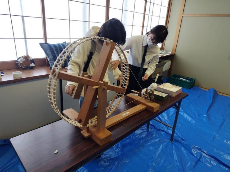 その他、六年制の1年生と5年生の有志が「松阪もめん人物語」という企画で、松阪もめんを支えてこられた方にインタビューしたものをまとめ、展示しました。放送部は、ステージの司会、記録写真の撮影などを行いました。演劇部は、舞台発表と3Fステージの照明を務めました。中学の有志生徒が地域の方とコラボし、糸紡ぎ体験を行いました。