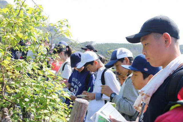 9時30分頃登山口から登り出しましたが、予定よりもかなり早く10:30頃には4クラス共に頂上付近にいたようです。そして、11時40分頃には先頭のA組が坪庭に戻ってきました。登山途中のこだまポイントから、クラスごとに大声で呼びかけた声は、坪庭で待機をしていた先生にもしっかり届いていたそうです。