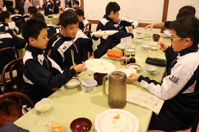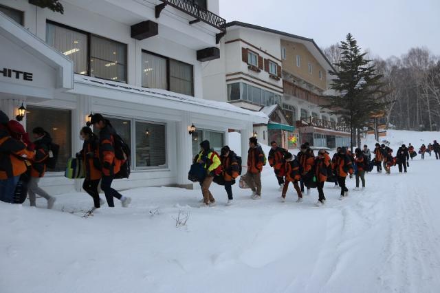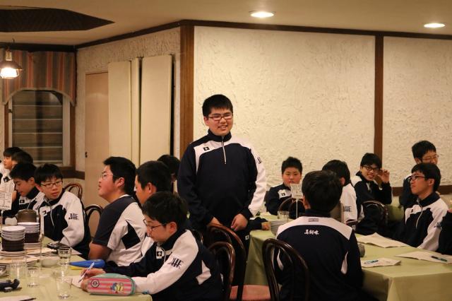 道中から集団行動、5分前行動がきちんとできており、無事ホワイトホテルに到着しました。到着後、これから4日間お世話になるホテルの方に挨拶し、その後夕食をいただきました。到着は遅れましたが、一人一人のきびきびとした行動により就寝時間は予定通りでした。夜はゆっくり休み明日のスキーに備えます。
