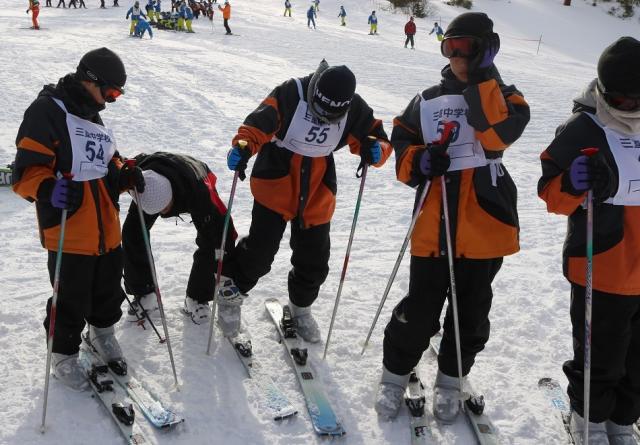 いよいよスキー練習開始です。開会式後、インストラクターの先生について、ゲレンデに向かいました。スキー練習班に分かれ、初心者は板を履くところからしっかりと教えて頂きました。日中気温は高かったですが、昨日の雪が残っており、最高の環境で練習できました。