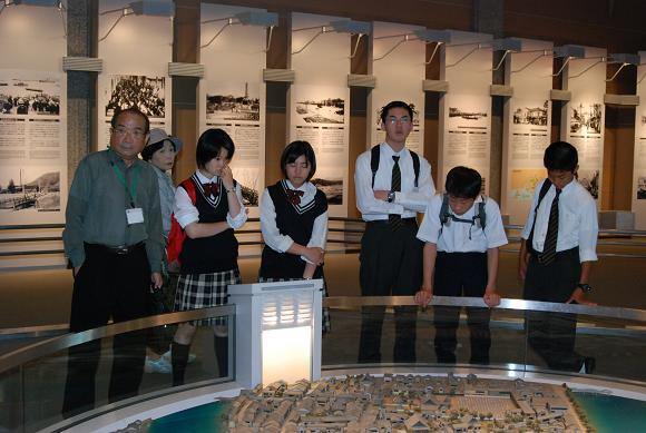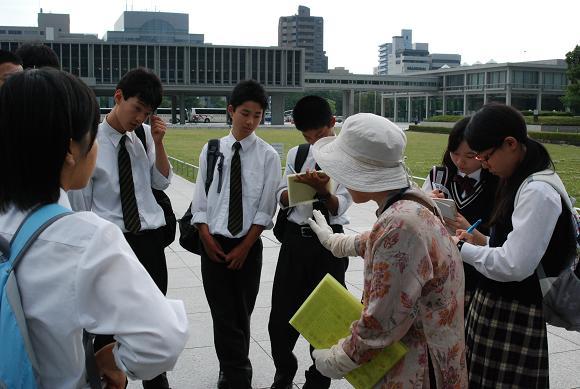 広島平和記念資料館の見学の後、ボランティアの方の案内で慰霊碑めぐりをしました。5月21日に事前学習で葉佐井博巳先生による「被爆体験講話」を聞いていたことで、この日の見学がさらに有意義なものとなりました。葉佐井先生は資料館で私たちを出迎えてくださり、慰霊碑めぐりにも同行していただきました。