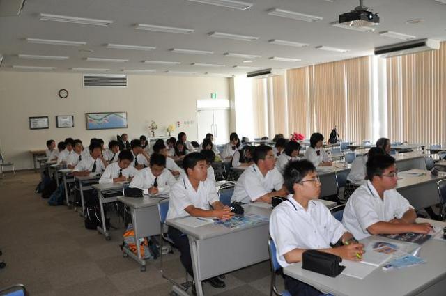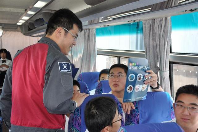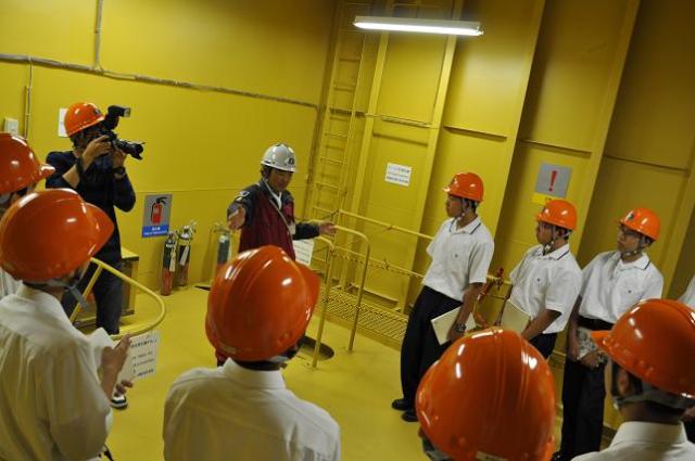 まず、福山市の常石造船・常石工場を見学しました。画像による紹介・安全研修施設での体験・バスでの工場内見学というプログラムでクラスごとの研修となりました。200メートルに及ぶドックや建造中の船のスケールを体感することができました。見学中のバスでは職員の方が案内していただき、生徒からは次から次へと質問が出て、活発な「移動教室」となりました。