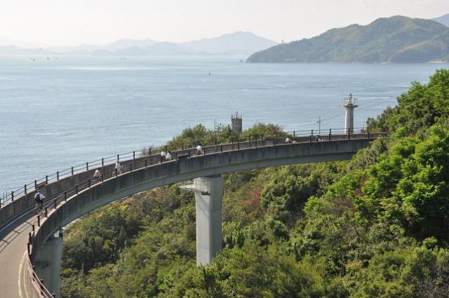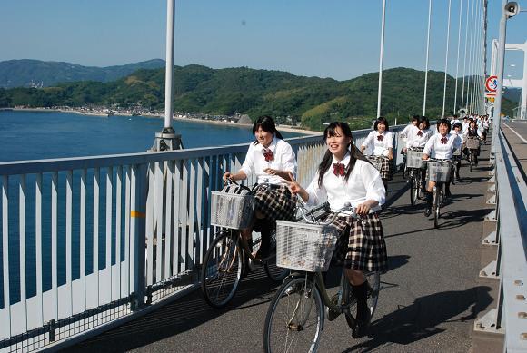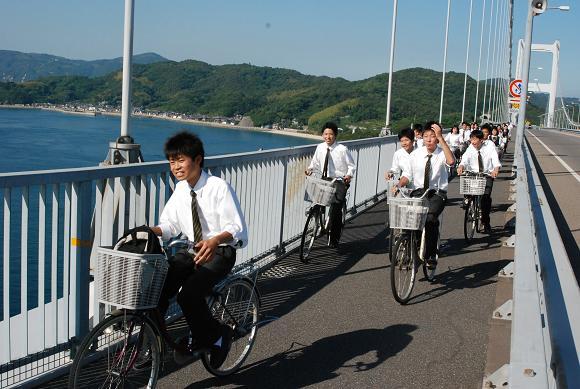 「歴史」の時間のあとは「体育」。来島海峡大橋のサイクリングを楽しみました。生徒・教員そして添乗員まで総勢151名全員が約6キロを走りました。校長先生は橋に上がる登坂ですでにへとへとの様子。橋からの瀬戸内の眺めは言葉に尽くせないほどすばらしいものでした。宿泊は奥道後温泉で、サイクリングの疲れがとれました。