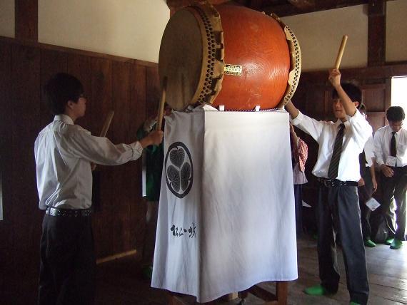 松山城特別見学では、ボランティアガイドの皆さんの案内で一般には公開されていない重要文化財の建物の中に入り、歴史を感じることができました。登城太鼓をたたく機会もあり、貴重な体験となりました。ふもとの東雲神社では鎌倉時代から江戸時代の能面や装束を特別に見せていただきました。