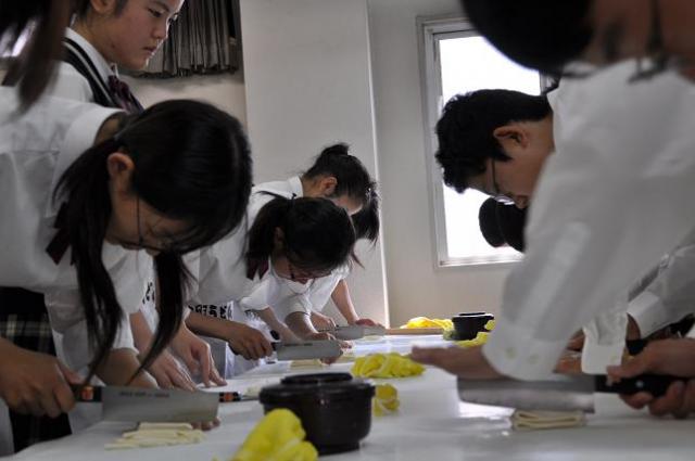 最終日はバスで帰校。途中で讃岐うどんの製作体験と大塚美術館の見学をしました。讃岐うどんはその名も「中野うどん学校」の校長じきじきの愉快な指導のもと、まずは生地を伸ばしてたたんで切って、うどんを作り、そのあと小麦粉から生地を作る作業を体験しました。季節によって食塩水の濃度を変えること、足を使ってこねることなど讃岐うどんの「秘伝」を学びました。