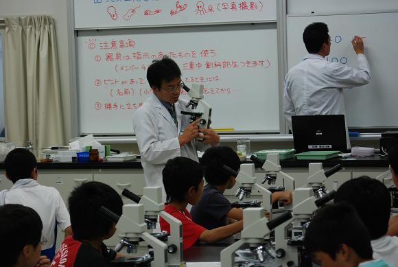 伝統の理科は。『ミクロの世界をのぞいてみよう!』という講座で、午前・午後と2回開講しました。三重中の創作科学部の生徒がアシストし、一人ひとりが顕微鏡で見た画像をプリントアウトして「お土産」として持って帰ってもらいました。