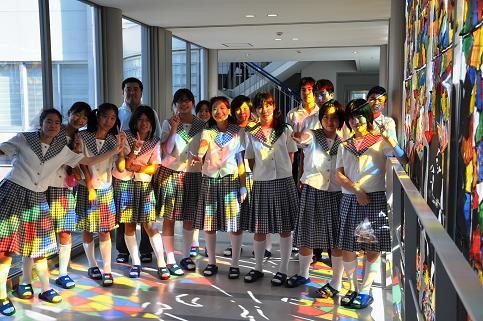 3年生の製作した渡り廊下のステンドグラスの光の中で