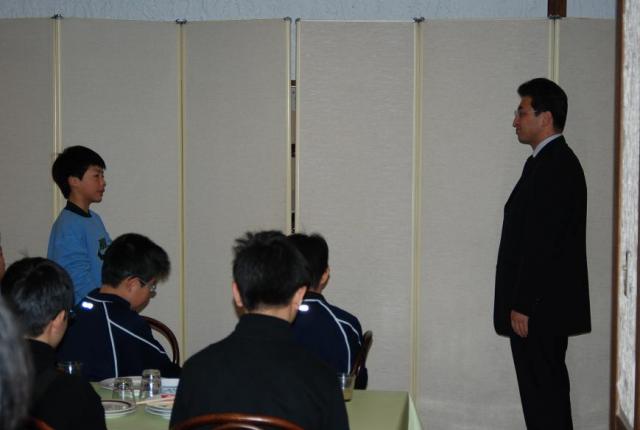 午後の練習前にインストラクターの方々のデモンストレーションを、見学させていただきました。目の前のゲレンデを一列に並んで、まったく隊列を乱さず滑って来られる先生方のお姿に三重中のみんなは圧倒されていました。