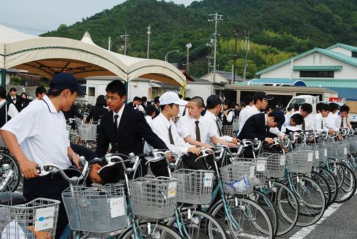 午後はしまなみ海道が舞台でした。全国の国宝・重文甲冑の約8割を収蔵するといわれる大山祇神社宝物館で歴史を感じたあと、来島海峡大橋の約6キロをサイクリングしました。夜は三重高OBの東山愛媛大学教授にメッセージをいただきました。