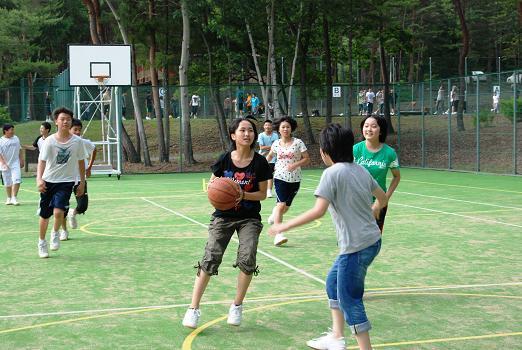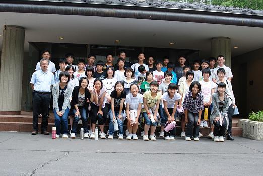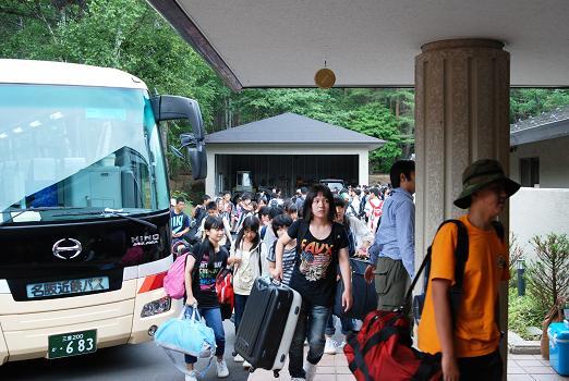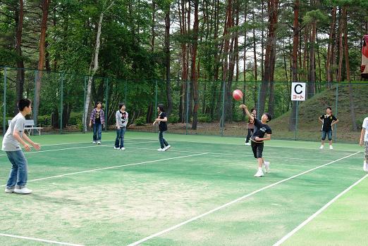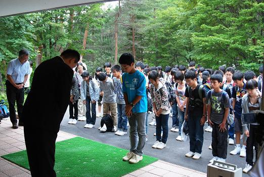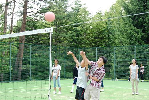 7月25日(月)、定刻どおりに出発。途中、三重県北部~岐阜県にかけて所々でゲリラ雨に出会いながらも、セミナーハウスに近づくにつれお天気は回復し、予定の時刻に入館した後は、外で思いっきりレクリエーションを楽しみました。白樺やカラマツの林の中にあるセミナーハウスはとても瀟洒な建物で、生徒たちも「素敵なところだわ」と歓声をあげていました。蓼科はさすがに避暑地というだけあって、松阪に比べ格段に涼しく、生徒たちは木立の中のコートで、バスケットボール、ドッジボール、ソフトバレーのゲームで思いっきり体を動かしました。