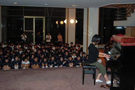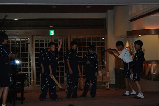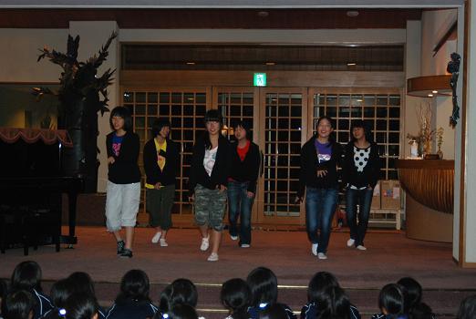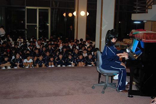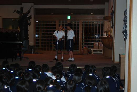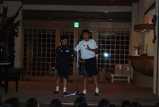2日目の夜はセミナーハウスでの一番のお楽しみ行事「夕べの集い」です。企画から出演まで生徒の手による「お楽しみ会」で、すばらしいピアノの演奏あり、抱腹絶倒の漫才・コント劇あり、可愛らしい歌とダンスのステージありと、三重中生の才能豊かな一面を次々に披露して会場は大いに盛り上がりました。