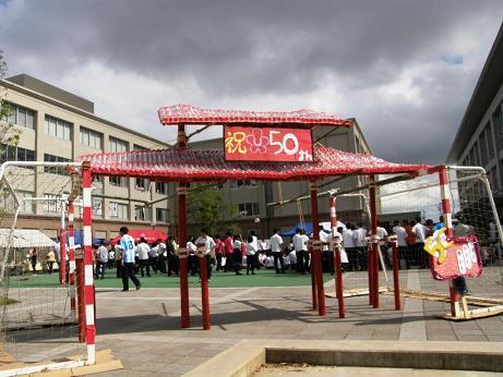9月14日(水)・15日(木)の両日、生徒会主催で学園祭が行われました。今年は創立50周年の記念すべき学園祭を目指して、各学年とも例年にも増して力が入りました。14日は舞台発表、15日は教室・屋外の展示・発表が行われ、多くの家族の皆さん、そして卒業生に来ていただきました。15日には同じ学園の梅村幼稚園から53人の小さなお客様を迎えました。
