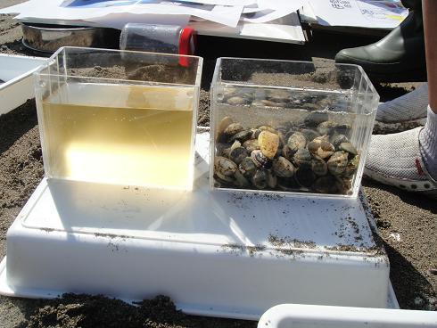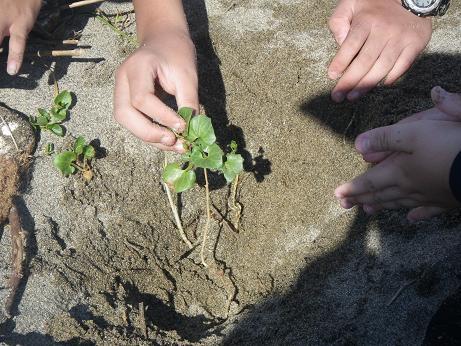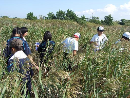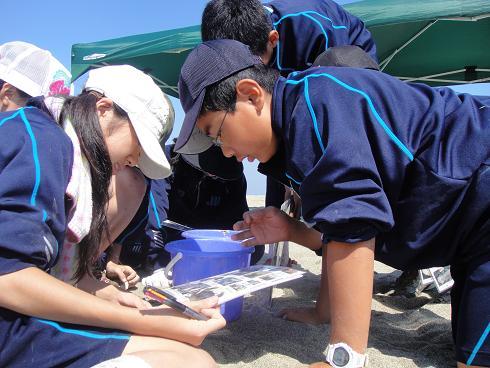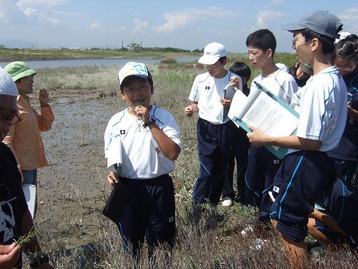 生徒たちは三重大学の木村妙子先生による「塩性湿地の生物たち」、松阪漁業組合長の大橋純郎先生による「漁業者の目から見た松名瀬海岸」、自然観察指導員の木原寿代先生による「海岸植物のくらし」と三重県水産研究所の水野知巳先生による「干潟の二枚貝とその役割」の4つの講座を受け、実地研修をしました。三重県水産資源室の川上さん、三重大学の木村昭一先生の専門家の方々、そして松名瀬町自治会長の小藪さん、西黒部公民館長の小川さんをはじめ地域の方々にも支援していただきました。 生徒たちは、講師の先生方のたいへん興味深く、わかりやすい説明に興味津々でした。海や湿地に入って生物を観察・採取したり、海岸に生息する植物などをスケッチするなどの活動がありました。どの講座においても、生徒たちにとって多くの新しい発見がありました。自然豊かな海岸として知られている松名瀬海岸の素晴らしさも実感しました。また、松名瀬海岸での清掃活動にも貢献できました。教室では得られないような貴重な体験ができ、生徒たちにとっても大満足の一日になりました。