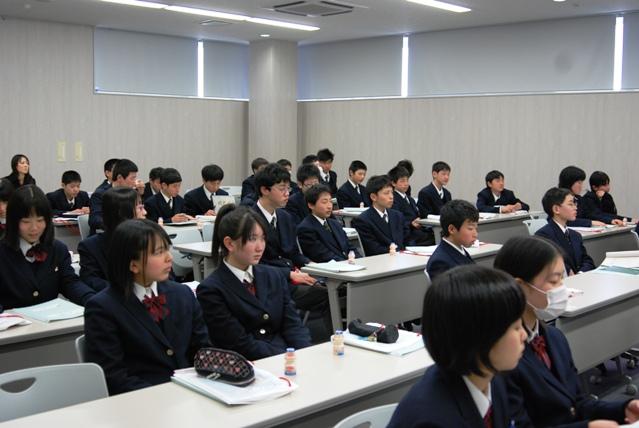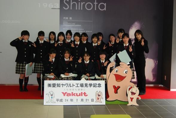 44名で愛知ヤクルト工場に伺いました。まず、前半の講義では、ヤクルト創始者の代田稔博士が、乳酸菌シロタ株の強化培養に成功したことなど、乳酸菌の科学性について学習しました。その後の工場見学では、実際にヤクルトなどを生産している様子を見ることができました。品質管理の方法なども説明していただき、生徒たちはメモを取りながら一生懸命聞いていました。