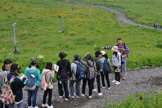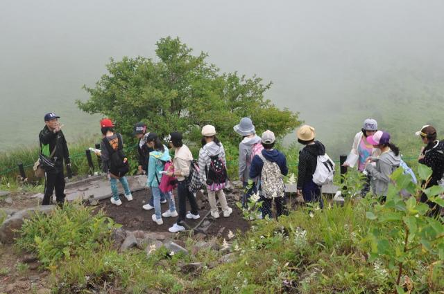 リフトを2回乗り継いで車山山頂に到着。山頂から見えるはずの日本標高一位の富士山と二位の北岳は霧のため見ることができませんでした。その後、八島湿原に向けてハイキングをスタート。天候にも恵まれ、ニッコウキスゲやヤナギランの群生、ウスユキソウ(エーデルワイス)、絶滅危惧種のコウリンカなど、図鑑の中でしか見たことのなかった珍しい植物を、実際に自分の目で一つ一つ確認することができ、充実した植生観察ができました。