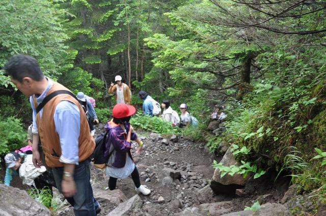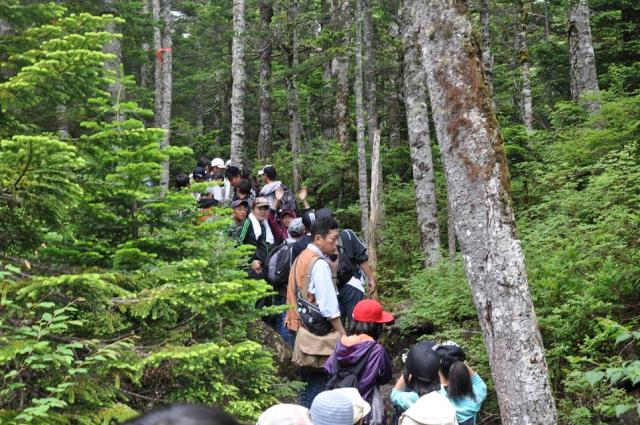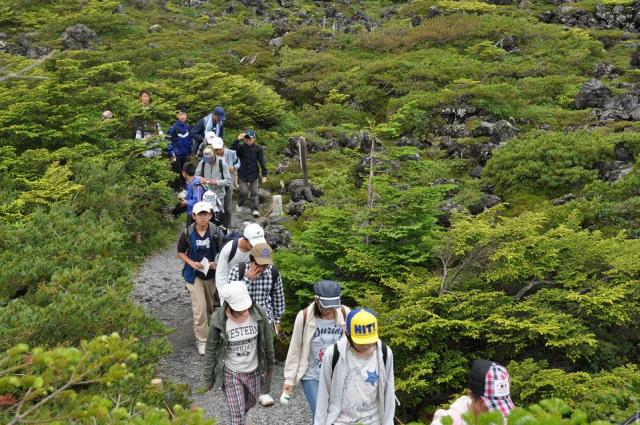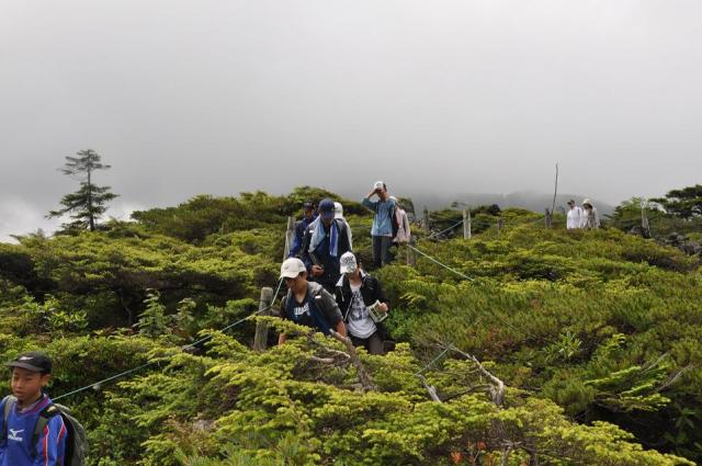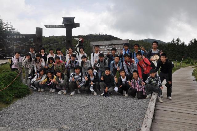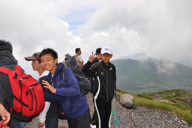 そこから北横岳山頂に向けて出発。途中険しい上り坂もありましたが、山頂にたどり着いた時の達成感はひとしおでした。初めは真っ白にかかっていた霧も、D組が到着したころには薄くなり始め、学年全員で記念撮影をすることができました。