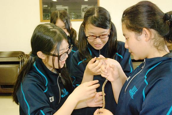 【とべ動物園】飼育に携わってみえる前田さんの講義の後、アオダイショウの子どもをみんなでタッチング。正しい扱い方を知ると誰でも触れることができます。その後さらに班に分かれて、ライオンに餌を与えたり、動物に触れて体温を感じたり、飼育体験をしました。