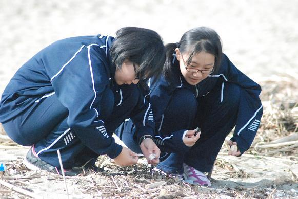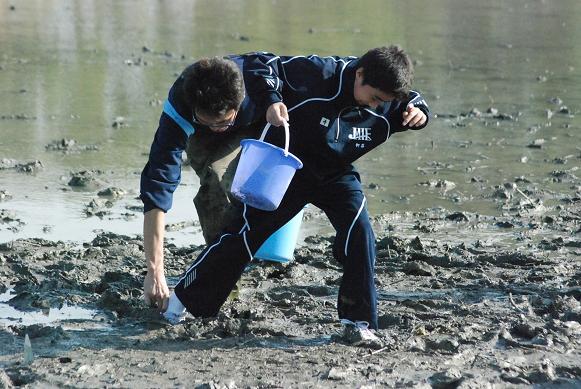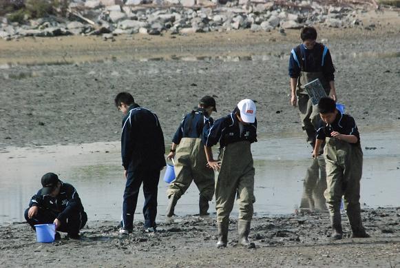 10月28日(月)、1年生理科のフィールドワーク『松名瀬海岸を調査しよう!』が松阪市にある全国有数の干潟である松名瀬海岸で行われました。今年で5回目を数えるこのプログラムは、三重大学の先生、三重県水産研究所の研究者、地元漁業組合の方をお招きし、三重中学校の理科教員と一緒に行うもので、次の4講座をクラスごとにローテーションで受講しました。