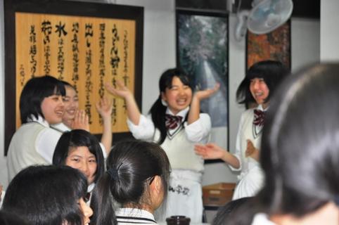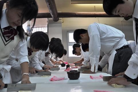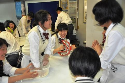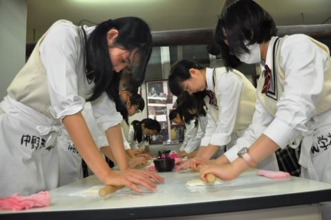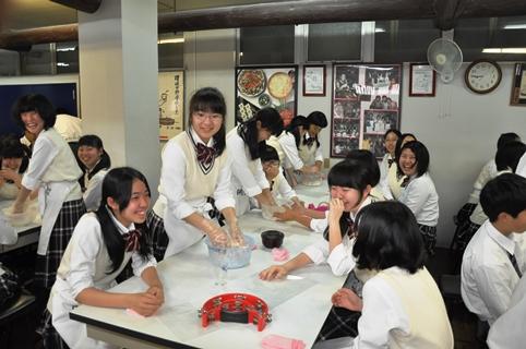 「中野うどん学校」で讃岐うどん作りに挑戦しました。讃岐うどんの特徴は何と言っても足でこねること。うどん学校の名物校長のカラオケのリズムに合わせて、みんなノリノリでステップを踏みました。できたうどんは、めん棒にまいた「うどん作り免許皆伝」の巻物と一緒に、お土産として家にもって帰りました。