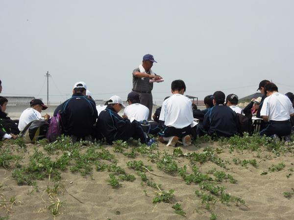 6月2日(月)1年生の理科で恒例の特別授業(フィールドワーク)『海の調査』を松名瀬海岸で行いました。4クラスがそれぞれ4つの講座をローテーションで受講するもので、三重大学、三重県水産研究所、松阪漁業協同組合から専門家をお招きし、三重中の教員も加わって講師を務めていただきました。