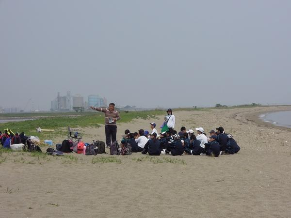 全国でも有数の干潟を有する松名瀬海岸でのフィールドワークは6年目を迎え、体験を通して学ぶという三重中の学習の柱の一つとなっています。 当日は季節外れの高温が予想されましたが、心地よい海風のおかげで、気持ちよく研修することができました。