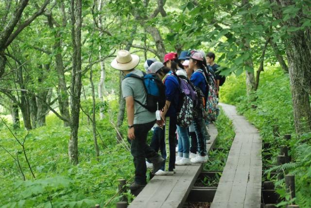 車山までリフトで上ったあと、八島湿原まで約3時間のハイキングを行いました。途中ニッコウキスゲの群生の中を通ったり、ところどころで理科の先生の解説を聞いたりと、充実したハイキングとなりました。