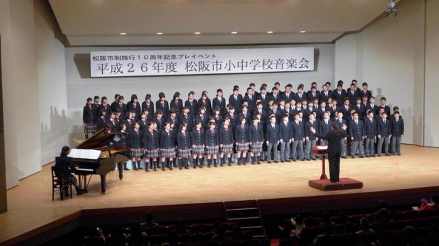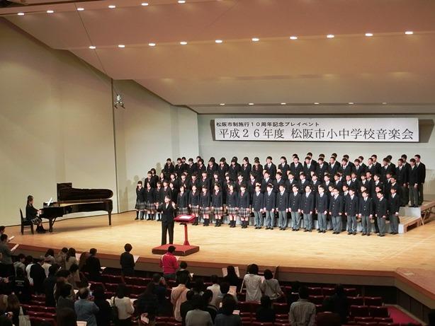 10月19日(日)、クラギ文化ホールで松阪市小中学校音楽会が行われました。三重中学校は恒例の中学3年生全員による合唱を午後の部の「とり」として披露しました。今年は定番のアカペラ「見上げてごらん夜の星を」と「あなたへ」の2曲を、その後、客席も一緒になって「もみじ」を歌ました。