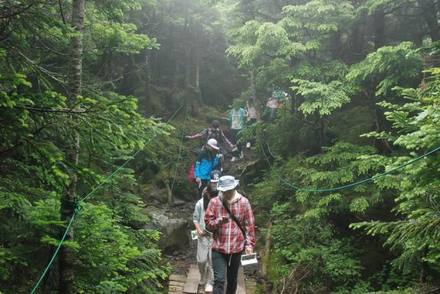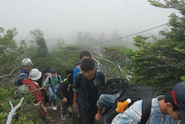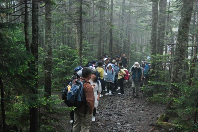 閉校式の後,北横岳登山に向かいました。ロープウェイで坪庭に上がり,坪庭の植物を見た後いよいよ登山が始まりました。最初は元気だったみんなも,急峻な登山道を進むにつれて無口に…。最後はみんなで励まし合いながら無事に登頂しました。山頂は霧がかかっていましたが,達成感でいっぱいでした。下山は少し余裕も出てきて,美しい縞枯れ現象も見ることができました。