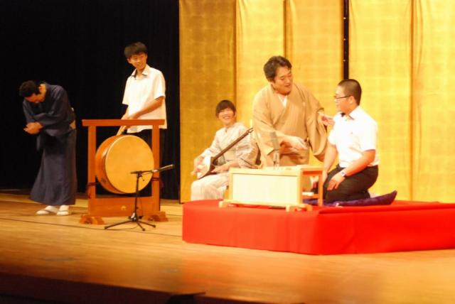 今年の芸術鑑賞は、落語家の方を招き、いろいろな話を聞かせていただきました。中学生でもわかりやすいように、落語の説明をしていただき、話もとてもおもしろいものでした。笑いが絶えず、たのしいひと時となりました。落語体験では、「お岩さん」の一節を生徒が演じました。
