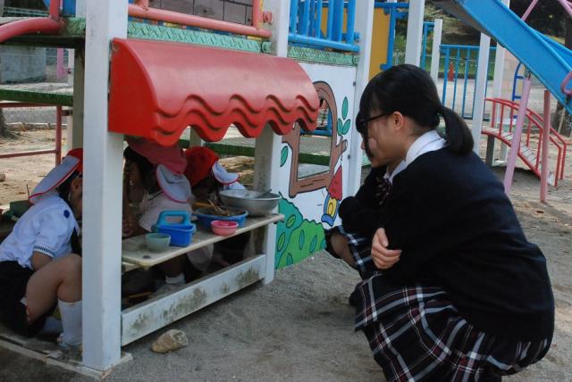三重中学校では毎年、3年生の家庭科の授業の一環として、同じ梅村学園の梅村幼稚園で保育体験を行っています。今年も学年を2班に分け、まず9月にA・B組で、2月にC・D組で実施しました。
