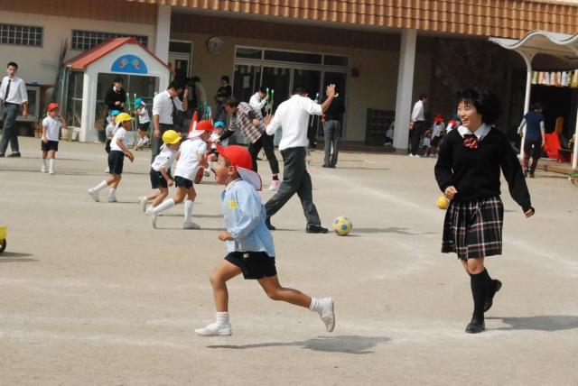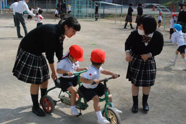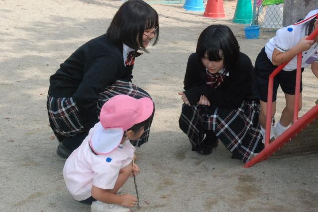 3・4限目の2時間を使い、授業で学んだ折紙を使ったり、一緒に遊戯をしたりしました。最初は中学生の方に戸惑いが見えましたが、園児たちの人懐っこさに助けられ、積極的に関われるようになりました。梅村幼稚園を卒業した生徒も多く、久しぶりの「母園」訪問となりました。