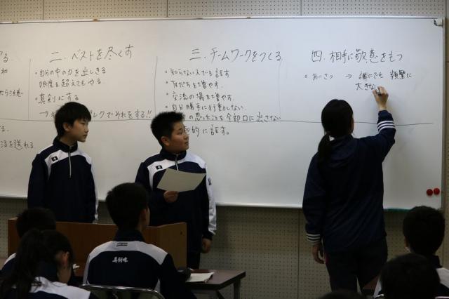 平成28年4月13日~14日、オリエンテーション宿泊研修が行われました。1日目は昼食から始まりました。友達とレジャーシートを寄せ合って、お弁当を楽しく食べました。その後、入所式、開校式がありました。中学校長先生から「命」のお話をいただき、生徒は集中して聴いていました。その後、集団行動、校歌練習がありました。一生懸命練習し、覚えたての校歌をクラス毎に発表しました。夕食・入浴後に教頭先生の講話を聴き、その後、クラスミーティングを経てクラスの団結力を高めました。2日目は、起床後に皆でラジオ体操を行い、気持ちのいい一日のスタートとなりました。朝食後、クラス対抗でスポーツレクリエーションを行い、大いに盛り上がりました。いろいろな種目に挑戦し、心をひとつにして頑張ることができました。レクリエーションを通して、学年全体で親睦を深めることができました。閉校式、写真撮影、昼食の後、バスで三重中学校へと無事帰着しました。