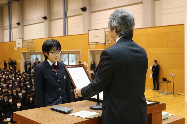 12月22日(木)、第2学期終業式と恒例の生徒会によるクリスマスコンサートが行われました。終業式では文化面で活躍した生徒の伝達表彰が行われました。校長訓辞の後、代表生徒が壇上に上がり、校歌を盛り上げました。大きな歌声が体育館をつつみ、校歌斉唱で終業式を終えました。
