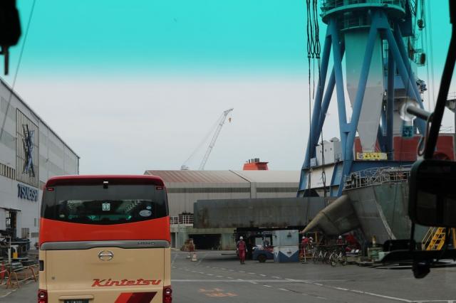 2日目は、常石造船所の見学に行きました。役員の方がバスに乗り込み、説明を聞きながら造船所の中まで入り、船をつくっている現場を見ることができました。最後に役員の方に質問をし、よい見学となりました。